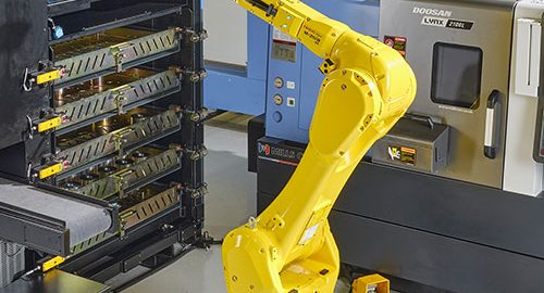SYNERGi Premier automated manufacturing cell featuring a Doosan machining centre (side load).