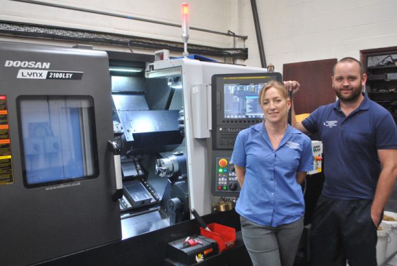 Erodatools’ Caroline Healey (Works Manager) and Jon Harper (Machine Shop Manager) with their first Doosan machine tool investment – the Lynx 2100LSYB multi-tasking lathe.